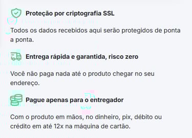Pague apenas para o entregador. Com os produtos em mãos, no dinheiro, pix, débito ou credito até 12x na maquininha do cartão.